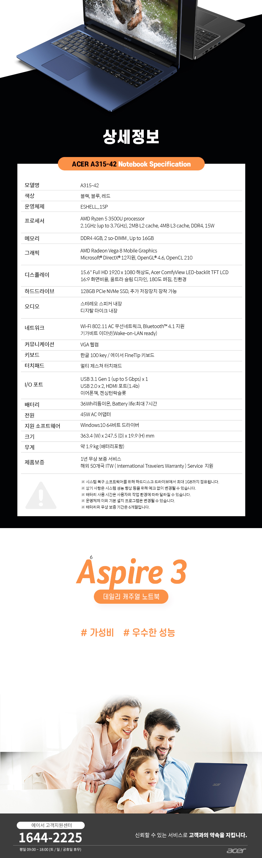 | AMD / 라이젠 5 / 피카소 / 3500U 2.1GHz(3.7GHz) / 쿼드 코어 / 39.62cm(15.6인치) / 1920x1080(FHD) / 눈부심방지 / 슬림형 베젤 / 4GB / DDR4 / M.2(NVMe) / 128GB / 라데온 Vega 8 / VRAM:시스템메모리공유 / 1Gbps 유선랜 / 802.11 n/ac 무선랜 / 블루투스 4.1 / HDMI / 웹캠 / USB 3.0 / USB 2.0 / 숫자 키패드 / 블록 키보드 / 36Wh / 운영체제 미포함 / 두께:19mm / 1.72Kg / 용도: 사무/인강용 / 색상: 블랙, 블루, 레드 |
